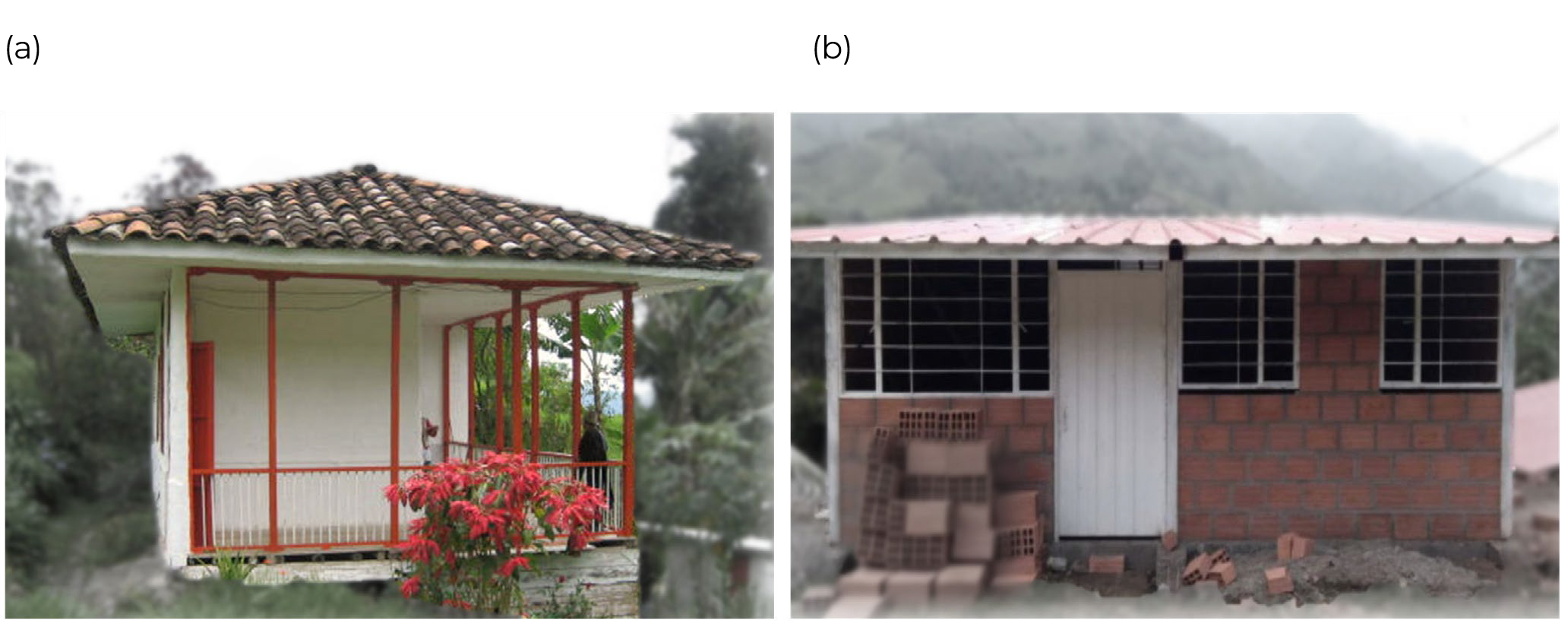 La paradoja radica en que, por una parte, se reconoce por el Ministerio de Cultura y la Federación Nacional de Cafeteros (MinCultura y FNC, 2014) y algunos ámbitos especializados (Muñoz Robledo, 2010; Muñoz Robledo, 2015; Muñoz Robledo et al., 2020; Rincón González y Montoya Arango, 2016) que el patrimonio arquitectónico que representa la Arquitectura Regional de Bahareque (ARB) constituye uno de los 16 atributos que dieron carácter excepcional al PCCC (Figuras 2 y 3a) (MinCultura y FNC, 2014; Osorio Velásquez, 2016), pero, por otra parte, debido a una inadecuada política de vivienda rural, otros organismos del Estado han ejercido presión sobre los propietarios de las viviendas vernáculas para que demuelan sus casas como condición para acceder a los subsidios de vivienda, a lo que sigue el suministro de una vivienda moderna que popularmente se denomina "de material", la cual es construida con un sistema convencional de muros reforzados de bloque de cemento o muros confinados de bloque arcilla con columnetas y vigas de hormigón armado y tiene la apariencia de una casa de barrio popular de ciudad, puesto que la entregan inacabada y con poca área. Estas casas modernas tienen bajas condiciones de habitabilidad y confort, y una imagen que afecta negativamente el paisaje, todo lo cual redunda en detrimento de la calidad de vida (Figura 3b). Esta controversia sociotécnica personifica las tensiones contemporáneas entre lo vernáculo y lo moderno, lo local y lo global, las cuales coexisten en el territorio.