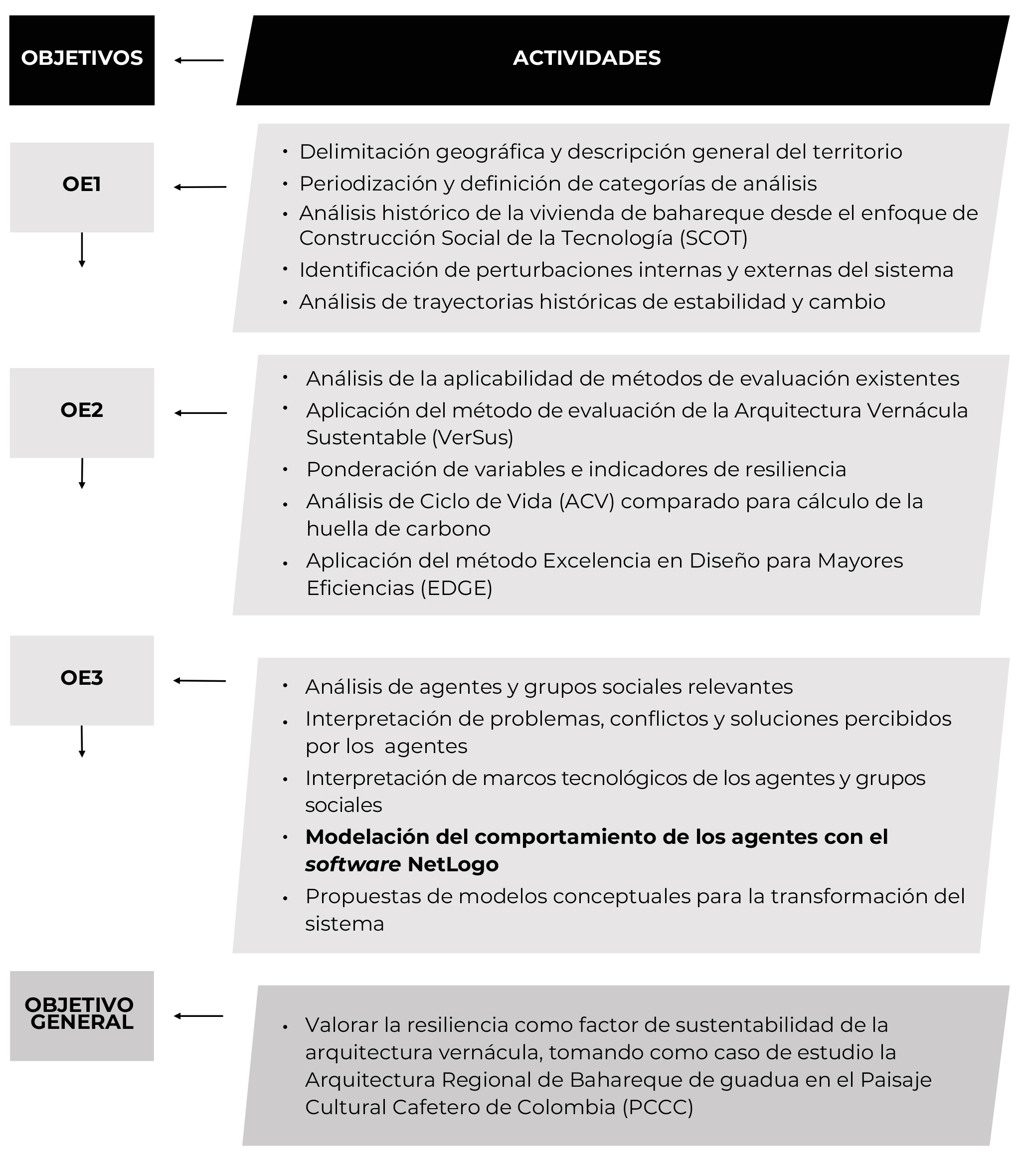 En cada objetivo se desarrollaron múltiples actividades que se relacionan en la Figura 4 con el propósito de dar el contexto investigativo del artículo en el marco del proyecto. Para el logro del Objetivo específico 3 (OE3) se adoptaron diversos enfoques y se aplicaron de manera concurrente varios métodos, uno de las cuales consistió en el desarrollo de una aplicación a partir del software de Modelos Basados en Agentes (MBA) NetLogo 5.3.1. para simular los patrones de comportamiento de los agentes vinculados a la vivienda vernácula, en cuyos resultados se centra el presente artículo.