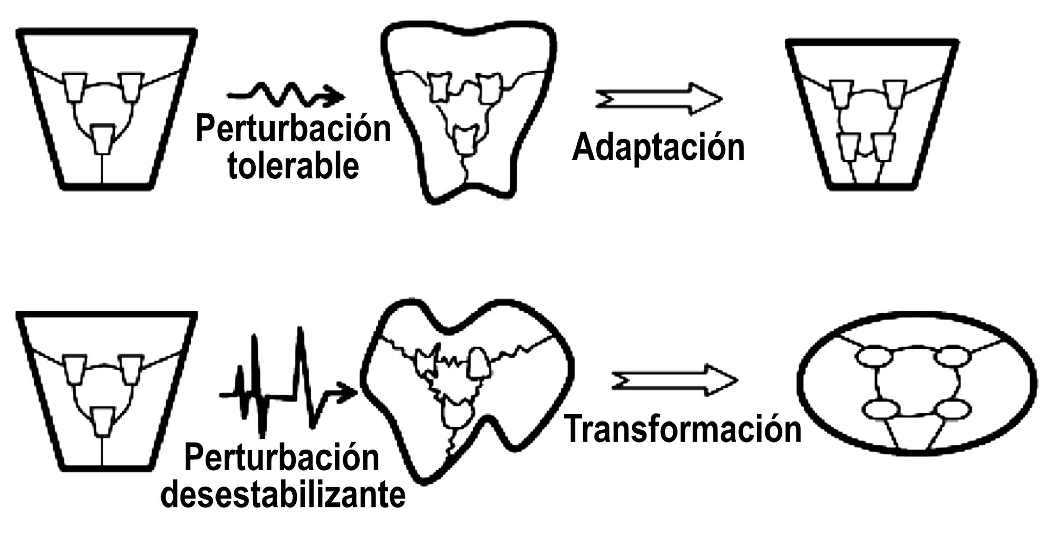 Al considerar los procesos de cambio en los sistemas socioecológicos, y dependiendo de su capacidad adaptativa, el sistema puede responder a la perturbación de dos maneras: adaptación o transformación (Raskin, 2006, p. 5) (Figura 5). En la adaptación, luego de la perturbación, el sistema sufre alteraciones, se reorganiza y cambia su configuración, pero conserva su estructura y su función (Walker et al., 2006 p. 1). Este tipo de cambios adaptativos originan diferentes configuraciones o estados alternativos del mismo sistema (Salas-Zapata et al., 2012, p. 77). Por otro lado, en la transformación, la perturbación supera el umbral de capacidad de respuesta del sistema, desencadenando alteraciones en sus atributos esenciales y modificaciones significativas en la estructura, de tal forma que pierde su identidad y se transforma en uno diferente (Castillo-Villanueva y Velázquez-Torres, 2015 p. 21). Esto se denomina cambio de régimen (Walker et al. 2006, p. 3).