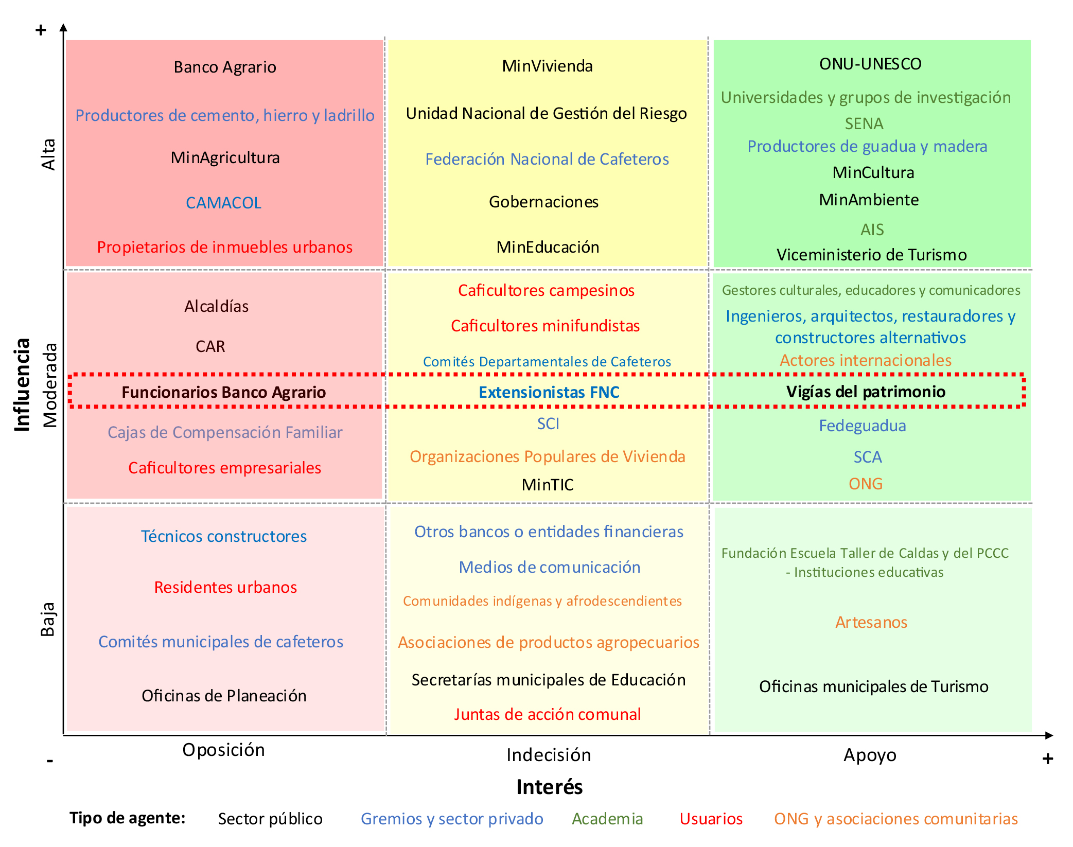 Si bien, en la controversia planteada intervienen múltiples agentes o partes interesadas (Figura 6), en términos de su interés respecto a la construcción de viviendas vernáculas de bahareque, estas se pueden clasificar en tres posiciones: apoyo, indecisión u oposición. En la práctica estas posturas se ven representadas por los funcionarios y vigías del patrimonio del MinCultura con una influencia moderada para el caso de la posición de apoyo, por los extensionistas de la Federación Nacional de Cafeteros (FNC) con una postura indecisa y una influencia moderada, y por los funcionarios del Banco Agrario con una influencia moderada para el rol de la oposición.