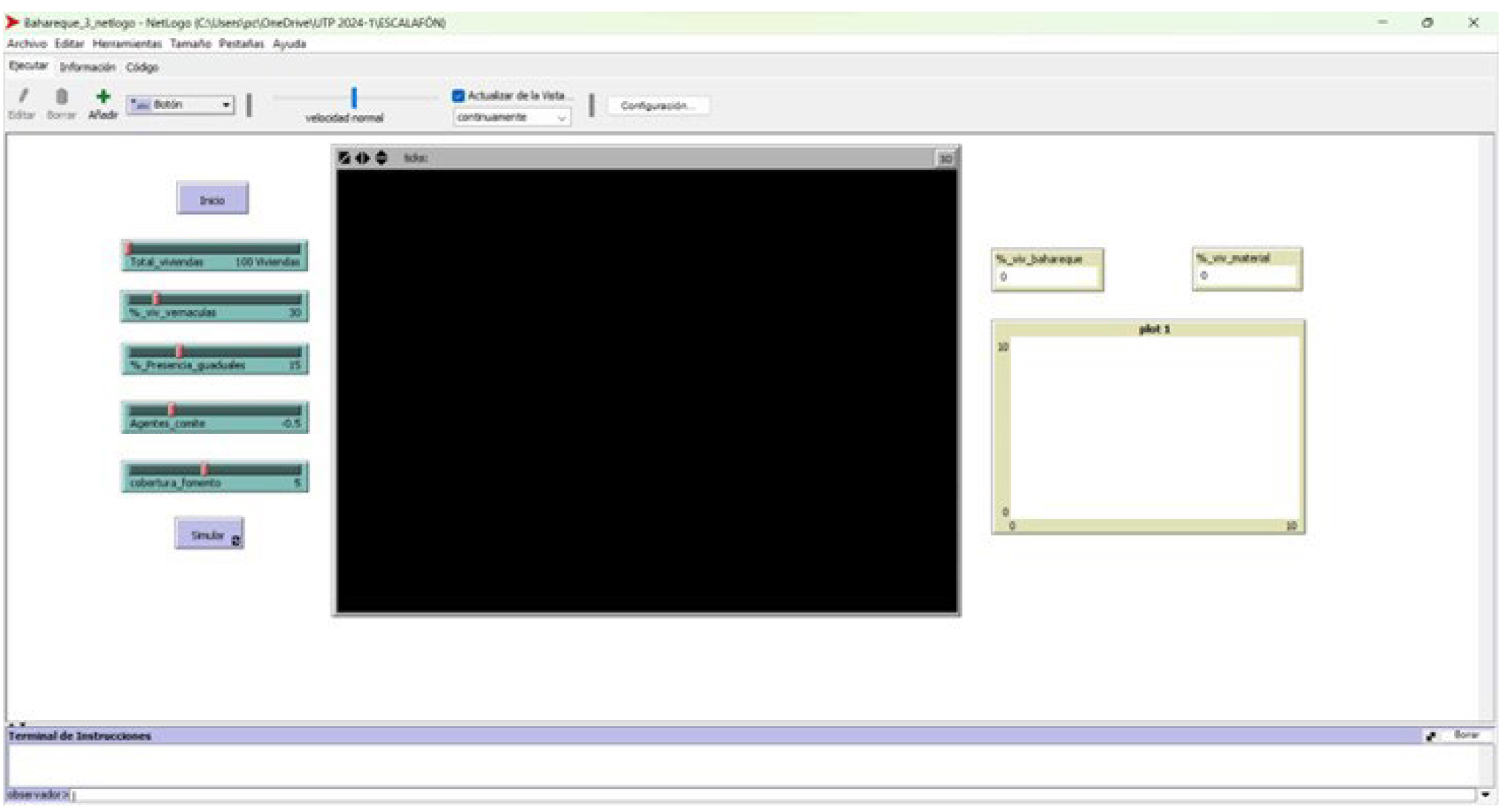 Para facilitar el uso del modelo, la ejecución de simulaciones, así como la lectura de resultados, se incorporaron en el simulador (ventana 'Ejecutar') un monitor y una gráfica. Adicionalmente, para introducir al modelo variables parametrizables controladas por el observador, se crearon varios controles deslizantes (sliders): total de viviendas, porcentaje de viviendas vernáculas, porcentaje de presencia de guaduales, agentes del Comité de Cafeteros y cobertura de programas de fomento, con las cuales se configuran los escenarios simulados. Finalmente, se introdujeron en el simulador dos botones de ejecución: el de 'inicio' y el de 'simular' (Figura 8).