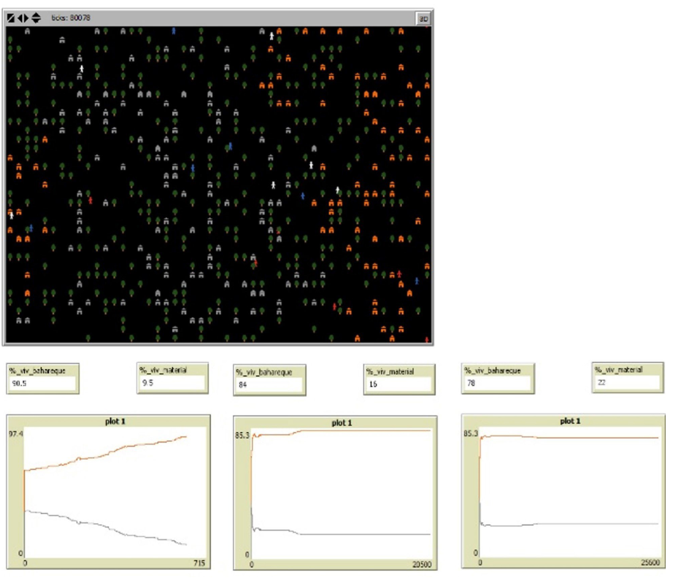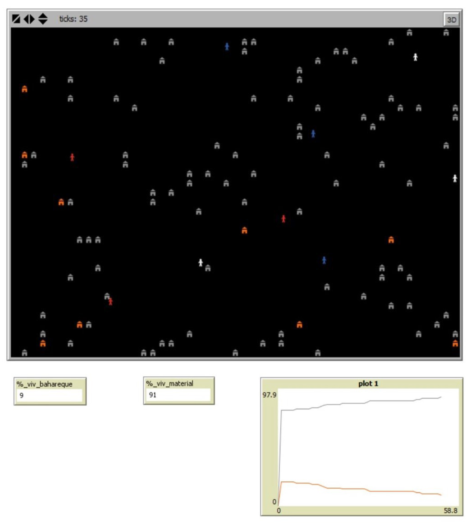 Una vez iniciada la simulación, los agentes institucionales comienzan a circular aleatoriamente por el campo y cada vez que pasan cerca de las viviendas, bien sean de bahareque o de material, comienzan a ejercer influencia sobre ellas, modificando gradualmente su percepción sobre el valor de la arquitectura vernácula, así, cuando el valor es mayor a 0, su color permanece o cambia a naranja y cuando es menor a 0, su color permanece o cambia a gris. Asimismo, considerando los comportamientos de los modelos de segregación, la percepción de las viviendas vecinas (w) incide en la percepción de cada vivienda también.