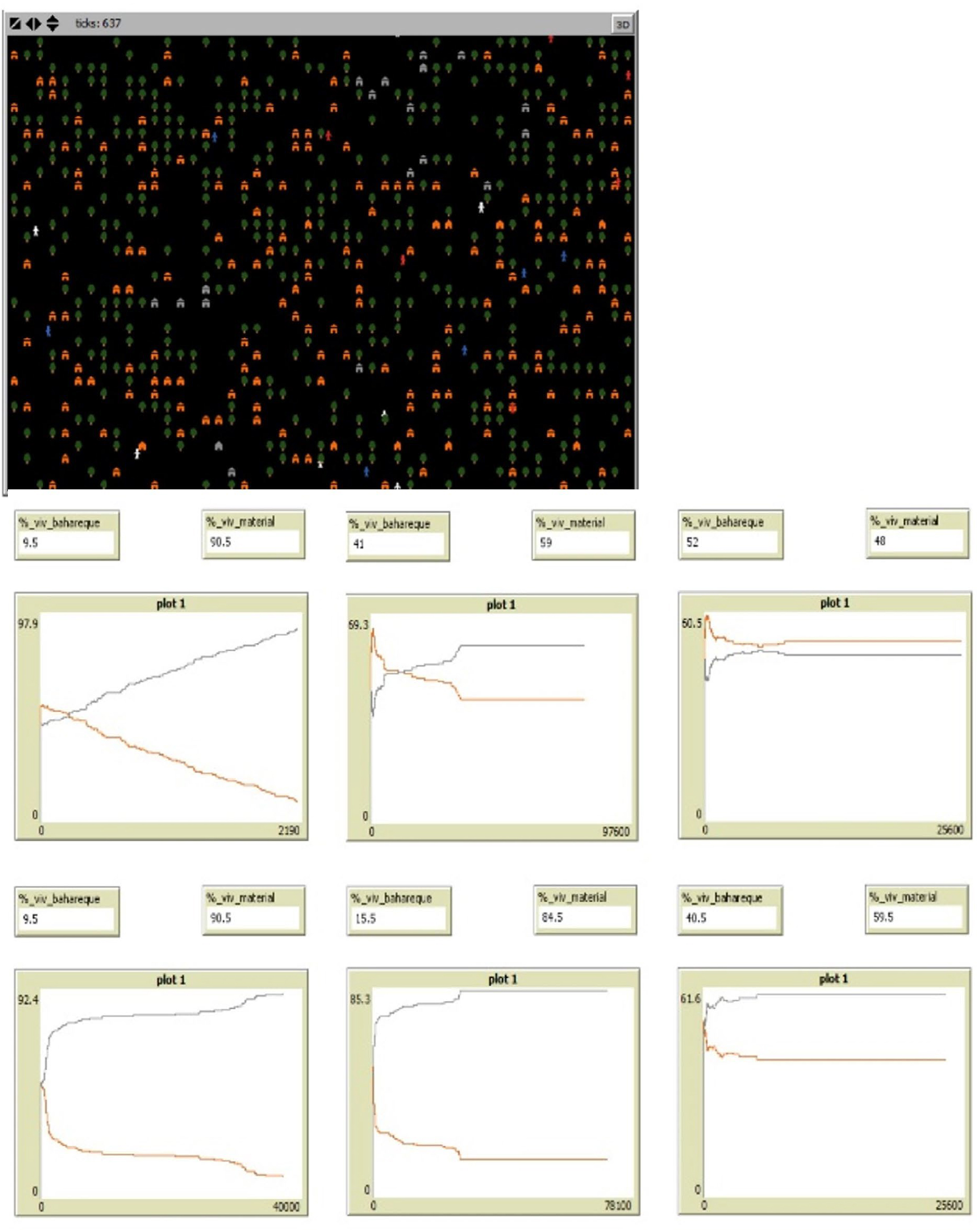 Se aumentaron las viviendas a 200 unidades, el porcentaje de viviendas vernáculas se aumentó al 40%, la presencia de guaduales en el territorio se aumentó al 20%; además, se modificó la percepción de los agentes del Comité de Cafeteros a un valor neutro de 0 y su rango de cobertura se disminuyó a 1, lo que haría muy inocuo su accionar, dejando que sean las conductas de entrada asociadas a las demás variables las que determinen el comportamiento del modelo. Como era de esperarse, este escenario resultó ser el más impredecible, pues si bien en promedio las viviendas de bahareque disminuyeron al 28%, esto se dio luego de 18.814,83 ticks en promedio. Al observar los resultados de la tabla 2 se evidencia que solo dos de las seis simulaciones superaron el 90% de viviendas de material que detuvo el modelo, mientras que las otras cuatro se estabilizaron con valores diferenciados: 41%, 40,5%, 52% y 15,5%; llama la atención que en la simulación 5, las viviendas de bahareque superaron a las de material con un 52%, evidenciando que el resultado final depende en alto grado de la distribución aleatoria de los valores de entrada en las viviendas. En este escenario se presentan tipos de gráficas muy diferenciados. La segregación de viviendas se hace evidente sin importar el porcentaje de distribución por tipología (Figura 10).