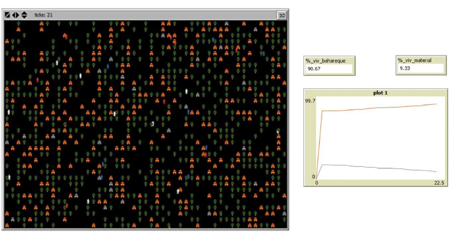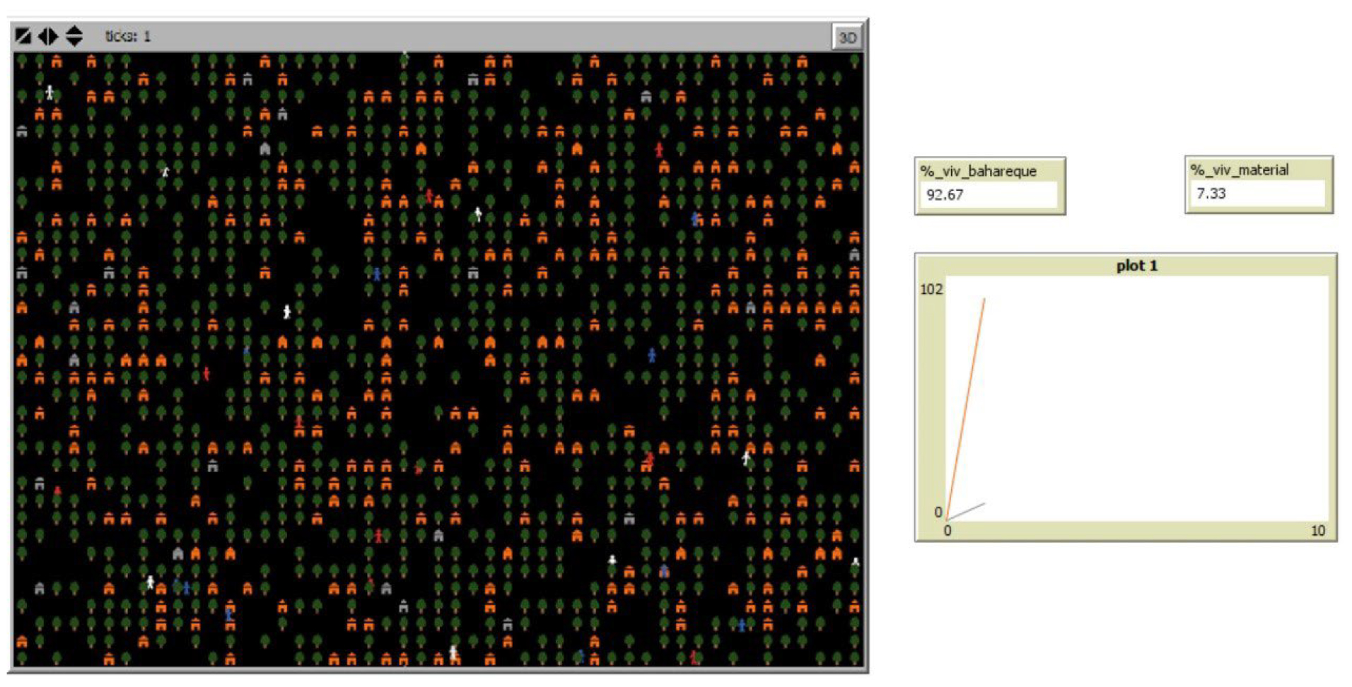 Cuando después de varios ticks, es decir, instantes o unidades primarias para marcar el paso del tiempo o contar las veces que se repite un procedimiento (Aguilera Ontiveros y Posada Calvo, 2018), el porcentaje de viviendas bien sea de bahareque o de material llega a un 90%, es decir, que una de las dos tipologías está próxima a extinguirse, la simulación se detiene.