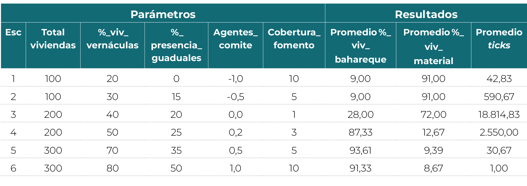 Se seleccionaron seis escenarios con parámetros diferenciados para probar el modelo (1Tabla 1) y cada uno se corrió seis veces (simulación), según se registra en las Tablas 2 y 3. Se introdujeron cambios graduales en los parámetros variables, lo cual permitió verificar el comportamiento del modelo y su capacidad de reflejar resultados diferenciados acorde con las condiciones simuladas entendidas como representaciones simplificadas de la realidad.