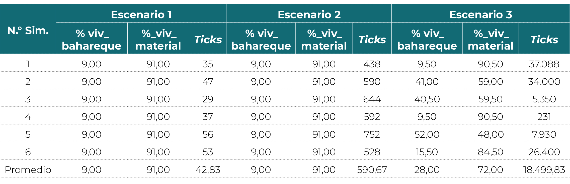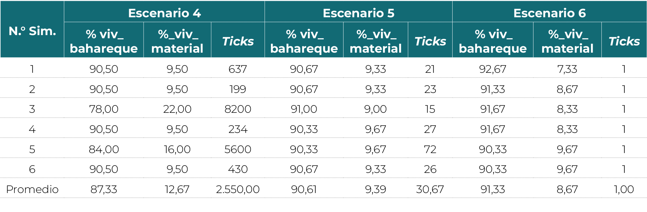 Los resultados variados de los escenarios 3 y 4 permitieron evidenciar que, a pesar de la posibilidad de controlar las conductas de entrada de múltiples variables del modelo en favor de las viviendas vernáculas, la aleatoriedad de los valores de entrada de las viviendas, a semejanza de la realidad, le confiere cierto grado deseable de indeterminación al modelo.