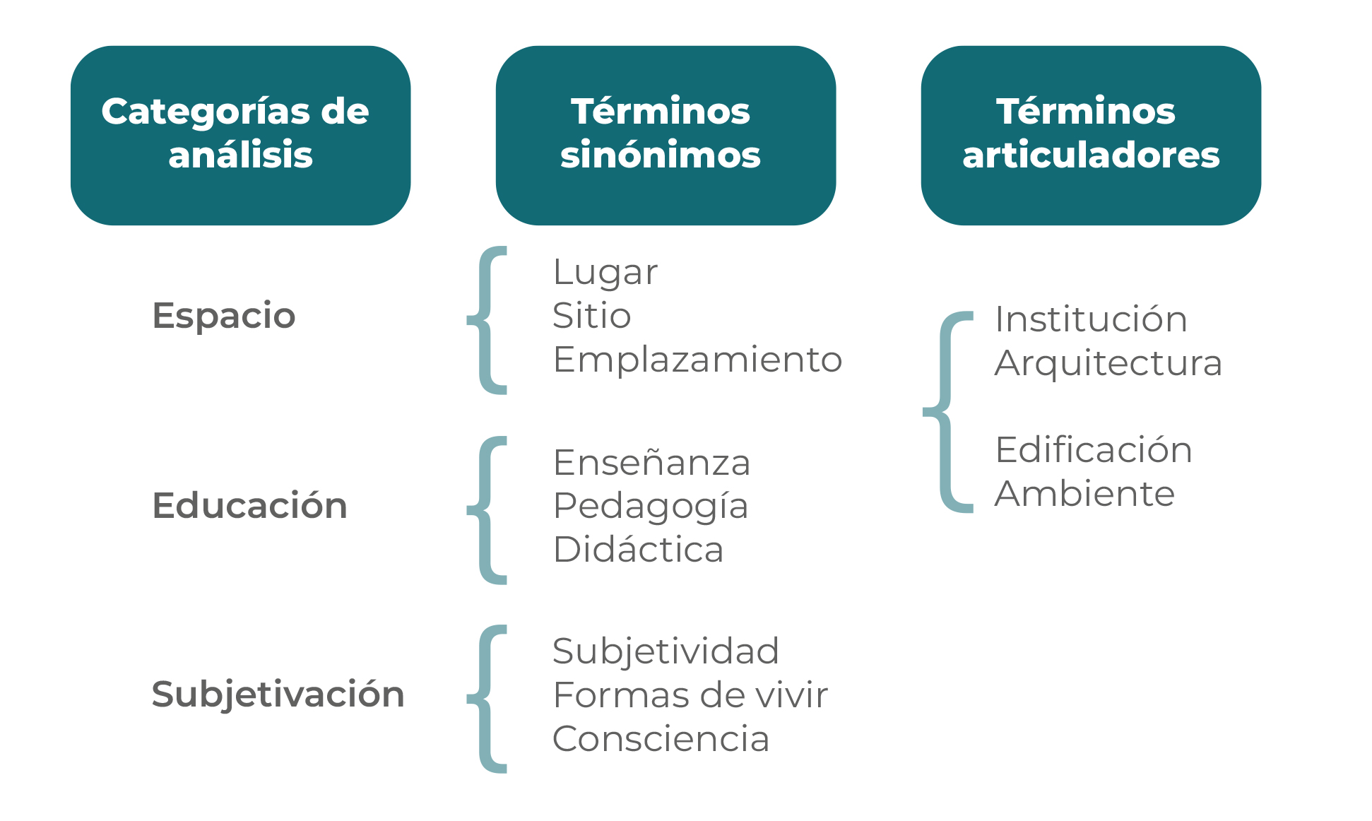 Los términos primarios que se utilizaron en la búsqueda fueron las categorías de análisis. Estos, como se muestra en la Figura 1, se combinaron con palabras sinónimas y términos articuladores. Aunque se priorizaron los tesauros sugeridos por la UNESCO, no fueron exclusivos, debido a que no se reconoce la categoría de análisis subjetivación junto a otros términos afines. A su vez, en algunas bases de datos los resultados no eran muy precisos, es decir, eran muy numerosos y poco relacionados con la estructura material donde suceden los procesos educativos. Aunado a lo anterior, dada la polisemia del término espacio (el cual suele utilizarse para hacer referencia a sitios tangibles o dimensiones inteligibles), se utilizaron términos complementarios que ayudaron a delimitar los resultados que arrojaban los buscadores. Así, en algunas ocasiones, se articularon cuatro términos para precisar la búsqueda. En todos los casos se aplicó como criterio de inclusión el descriptor booleano: 'y' junto al comando " " a inicio y fin de cada palabra.