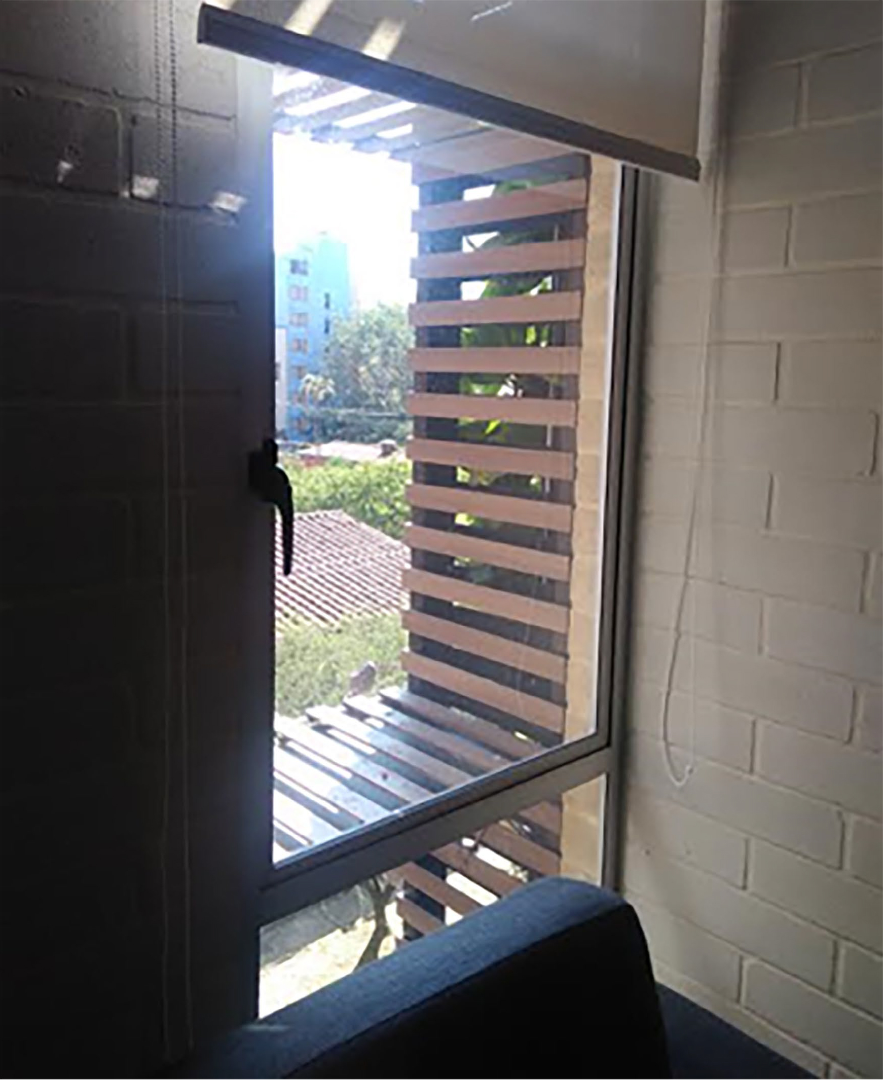 Figure 12 demonstrates a passive strategy to minimize direct solar radiation (Arango et al., 2019). These louvers eliminate the need for blackout curtains in hotel rooms, allowing clear views from the inside out, as evidenced below.