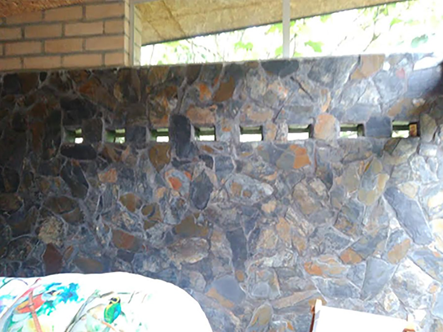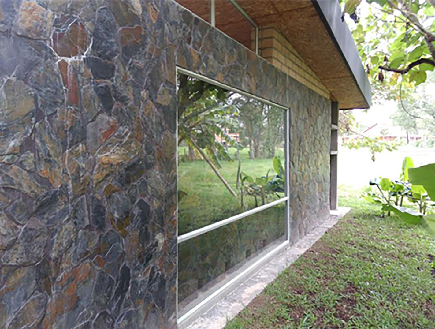 As shown above, the wall, initially built with soil-cement blocks (SCB), is clad in dark slate stone to absorb the sun's rays from the west and gain heat. The glass chamber creates a greenhouse effect designed to retain heat stored by the dark material. Instead of quickly transferring this heat to the surrounding air, the system gradually releases it into the interior through convection. Forthis purpose,vents are placed at the bottom and top of the wall, allowing heat transfer from the wall to the air. This convection process uses the air's lower density to circulate warm air into the interior space (Borbón et al., 2010).