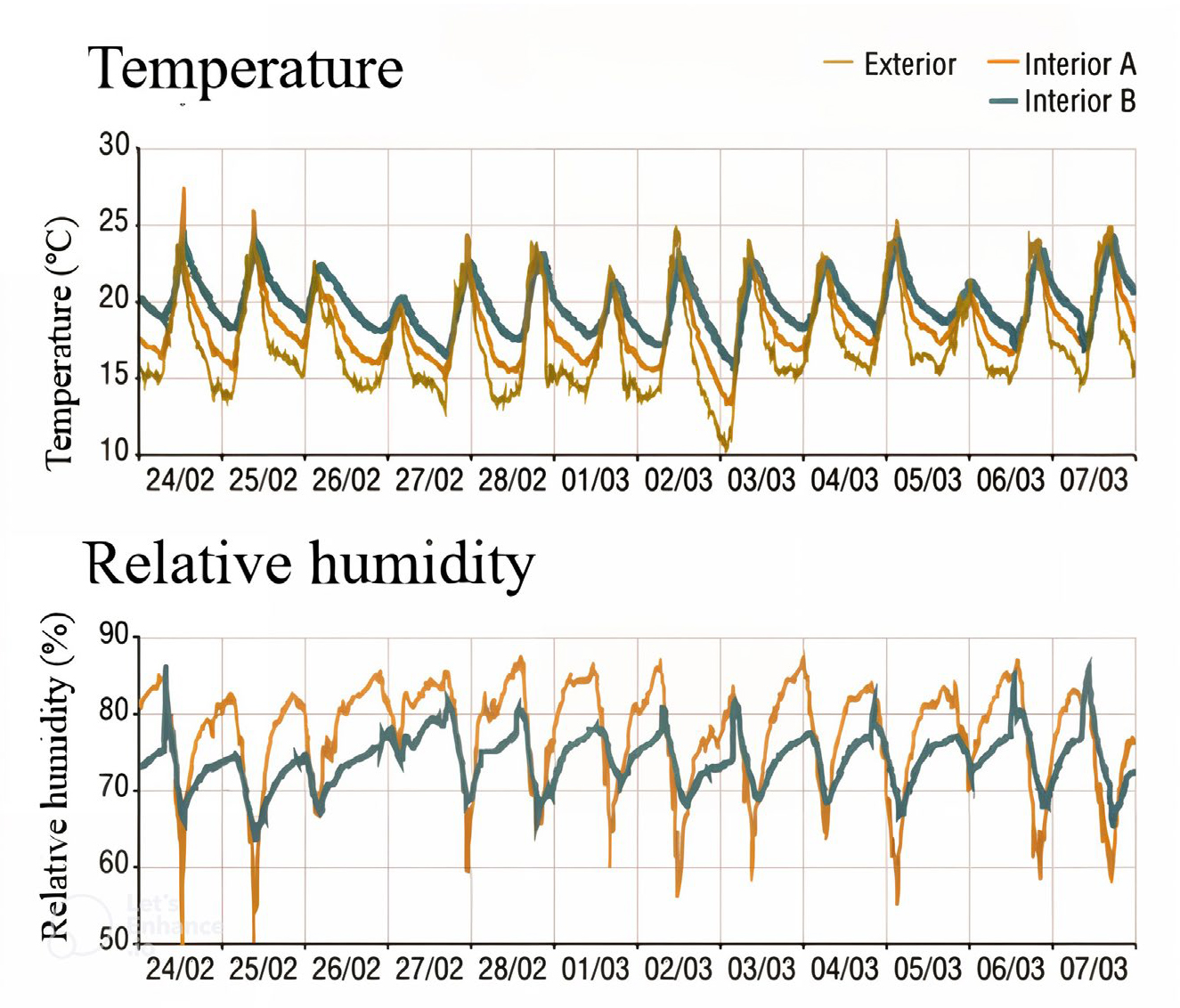 The exterior and interior temperature measurements have shown an optimal performance of the living comfort of this house, since while outside the temperature sometimes exceeds the comfort line of the area, inside it is cooler, and also, when outside the temperature drops to the point of feeling cold, inside it remains a few degrees higher.