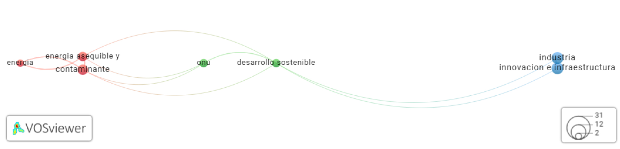 Mediante análisis de coocurrencia realizado con el software VOSviewer sobre un corpus de 350 artículos publicados en el periodo determinado, en las revistas de arquitectura latinoamericanas, que hacen referencia de modo directo o indirecto a los ODS se identificaron tres clústeres temáticos; el más frecuente fue el vinculado con sostenibilidad urbana y espacio público (ODS 11). En contraste, términos como 'energía' y 'ODS 7' apenas registraron aparición, lo que evidencia una baja representación temática. A partir del análisis realizado mediante VOSviewer sobre los artículos publicados entre 2015 y 2025, se evidenció una baja densidad en la coocurrencia de términos vinculados a los ODS, lo que evidencia la problemática. La Figura 2 muestra escasos clústeres temáticos consolidados, lo que sugiere una fragmentación en la forma en que los temas de sostenibilidad han sido abordados.