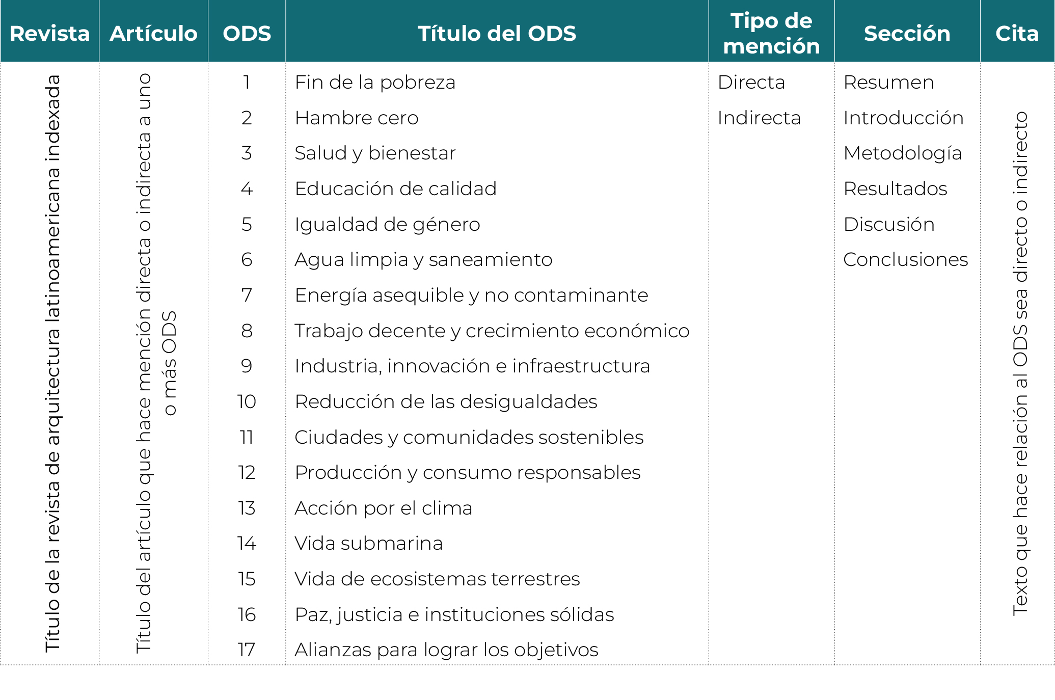 Se realizó una búsqueda sistemática en las bases de datos y archivos digitales de revistas de arquitectura indexadas en Latinoamérica, con el objetivo de identificar artículos publicados entre 2015 y 2025 que abordaran, de forma directa o indirecta, alguno de los 17 ODS. Para ello, se utilizó como fuente principal la plataforma de la Asociación de Revistas Latinoamericanas de Arquitectura (ARLA), lo que permitió el levantamiento y revisión inicial de 45 revistas indexadas.