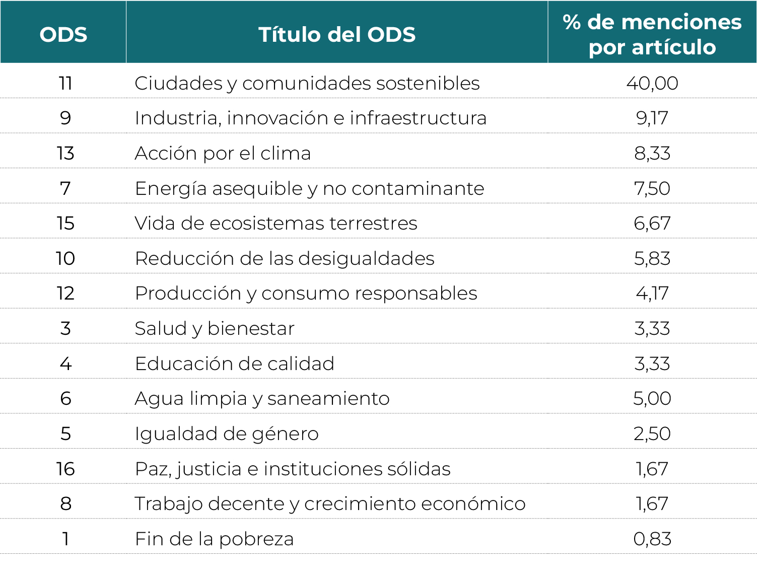 Tabla 2. Porcentaje de menciones a los ODS sobre los 120 artículos