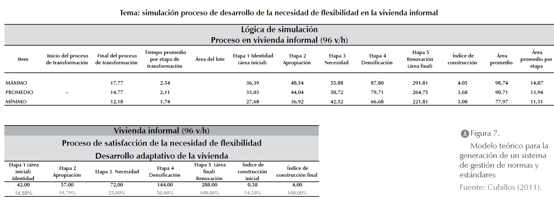 En segundo lugar, a partir del análisis normativo de las VIS del Recreo, producidas por Metrovivienda con una densidad de 240 v/h, se obtuvo que el proceso de transformación del hábitat de la vivienda formal se realiza en un periodo de tiempo de 11 a 14 años por vivienda. Las viviendas desarrollan su proceso de satisfacción de la necesidad de flexibilidad en un lote de 3,57 x 7 m (25 m²) y se inicia con un índice de ocupación promedio equivalente al 1% (25,00 m²). El proceso de transformación finaliza con un índice de ocupación promedio de 2,90% (71,50 m²). El índice máximo de ocupación es del 3,70% (92,20 m²) y el índice mínimo es de 1,90% (48,60 m²) (figura 8).