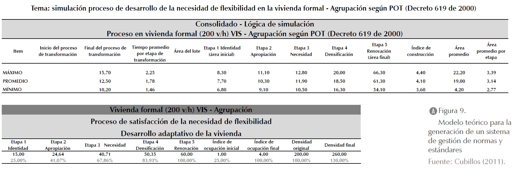 En tercer lugar, en el caso de las viviendas producidas a partir del Decreto 619 de 2000, con una densidad de 200 v/h, se obtuvo que el proceso de transformación del hábitat de este tipo de VIS se realiza en un periodo de tiempo de 11 a 14 años, con un promedio de 12 años por vivienda. Las viviendas desarrollan su proceso de satisfacción de la necesidad de flexibilidad en un lote de 3 x 5 m (15 m²), y se inicia con un índice de ocupación promedio equivalente al 1% (15,00 m²). El proceso de transformación finaliza con un índice de ocupación promedio de 3,80% (57,70 m²). El índice máximo de ocupación es del 4,70% (70,70 m²) y el índice mínimo es de 3% (45,30 m²) (figura 9).