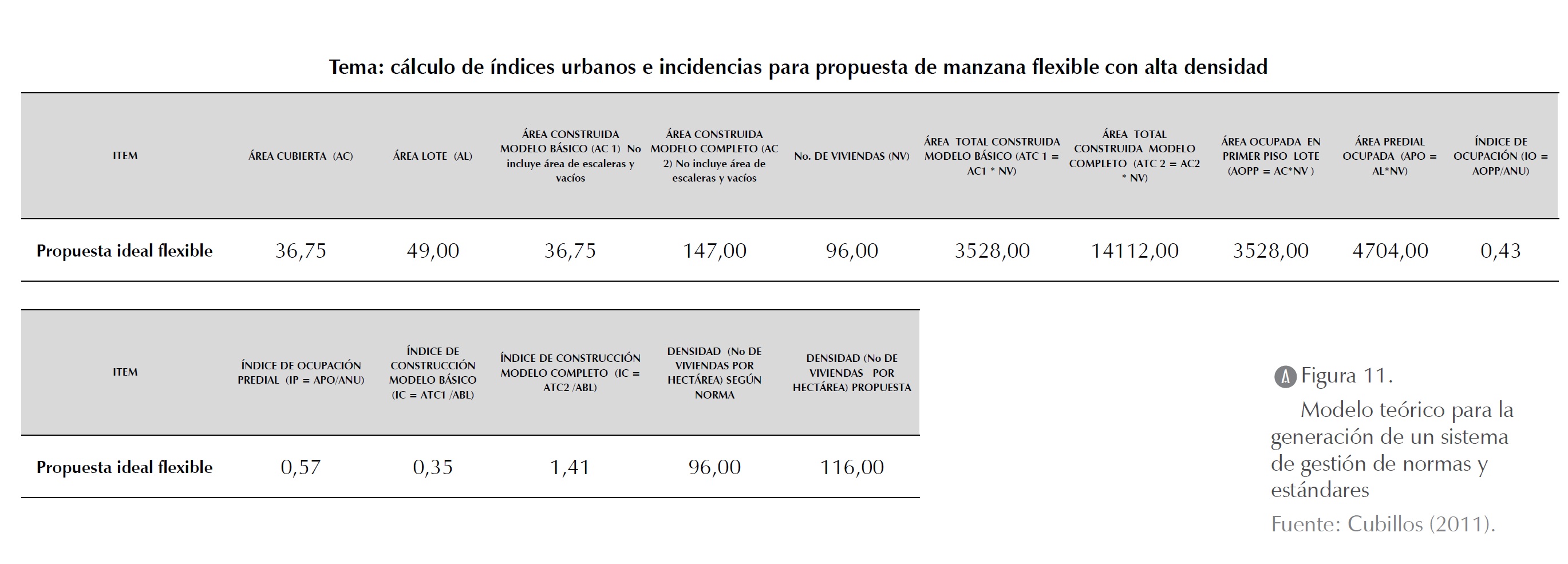 Finalmente, se propuso un modelo de agrupación a partir de la propuesta de lote individual flexible (Cubillos, 2010b, p. 95), con una densidad bruta predial de 96 v/h, una densidad neta predial de 116 v/h, y una densidad útil predial de 154 v/h, con un índice de ocupación predial del 0,57%. Esto nos permitiría desarrollar el proceso de satisfacción de la necesidad de flexibilidad. El desarrollo progresivo que se presentaría en la agrupación requeriría de una normativa de desempeño que reglamentara los procesos de subdivisión predial y subdivisión de niveles de las viviendas orientadas a la propiedad horizontal (figura 11).