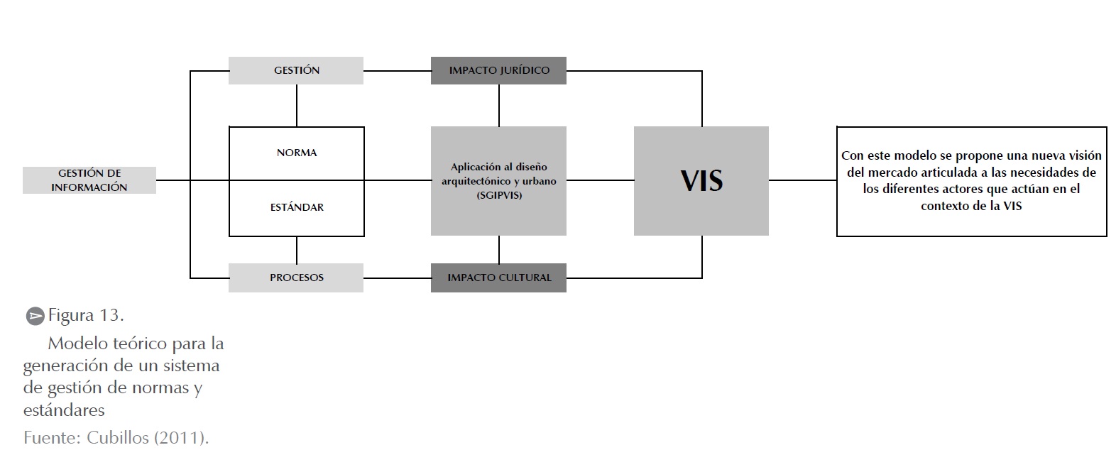 Además, la gestión de la norma se relaciona con el impacto jurídico que tiene a partir del proceso de simulación y evaluación de indicadores de impacto. Por otro lado, se evalúa el impacto cultural de la misma por medio de indicadores de calidad de vida y calidad cultural. Como resultado, se genera un producto contextualizado y articulado a las necesidades de los diferentes actores que actúan en la VIS (figura 13).