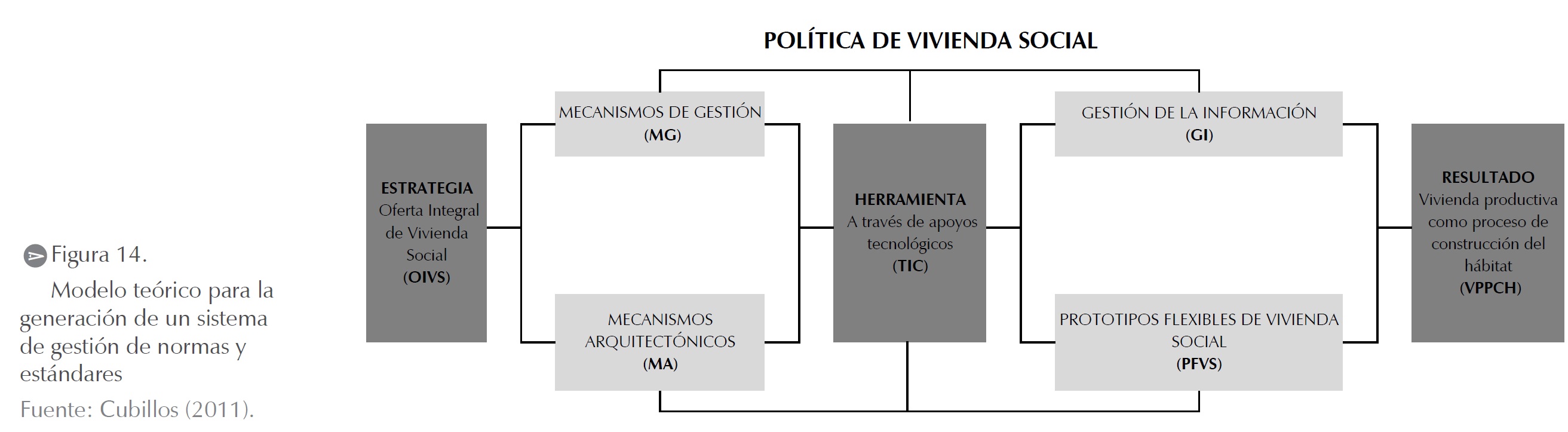 En segundo lugar, este proceso estaría mediado por herramientas TIC, tales como software aplicativo del sistema de gestión de información, dirigidas a la sistematización y el análisis de la información para producir de manera rápida y automática por medio del diseño de prototipos flexibles de vivienda social (Cubillos, 2010b). Como resultado, se generaría un proceso productivo de construcción del hábitat, el cual respondería a la necesidad de flexibilidad en su dimensión arquitectónica y urbana (figura 14).