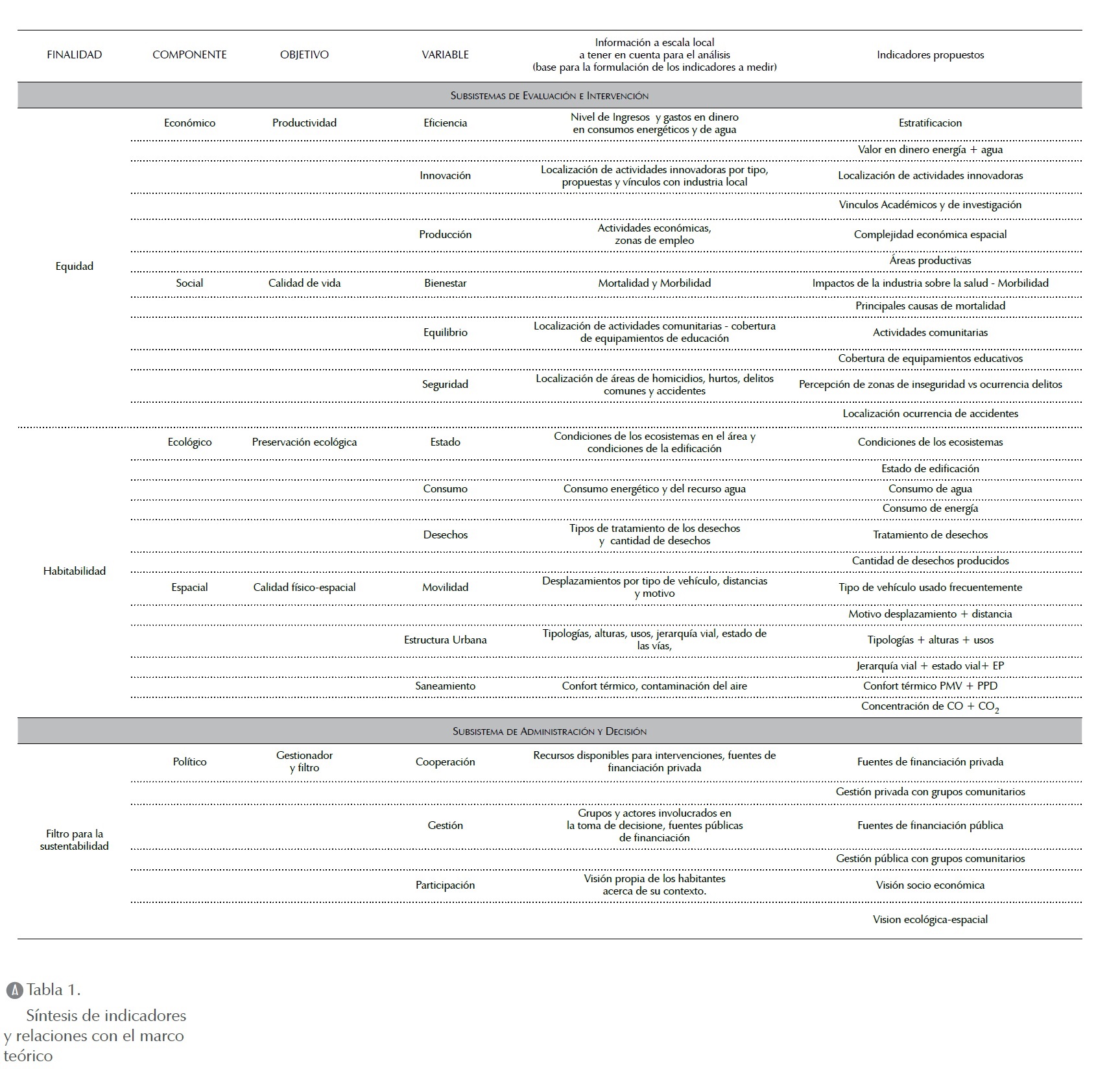 Desagregando el concepto de sustentabilidad urbana para ser comprendido bajo su finalidad, componentes y objetivos, se llega a la definición de cuatro subsistemas de evaluación e intervención: económico, social, ecológico (UN Hábitat, 2009; Allen et al., 2002; UN, 1993) y físico-espacial (López y Camelo, 2008) como componentes fundamentales para la determinación del nivel de sustentabilidad en un área urbana.