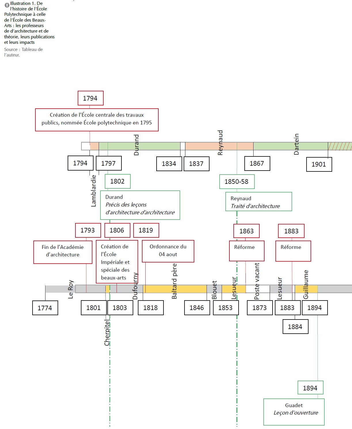 Depuis la création de l’École des Beaux-Arts en 1806 jusqu’à la fin du XIXè siècle, cette dernière ne produit pour ainsi dire aucune production théorique. Les publications des polytechniciens Durand (Durand, 1802-1805) et Reynaud (1850- 1858) apparaissent à des moments charnières de l’histoire de l’École des Beaux-Arts : après l’abolition de l’Académie en 1793 et quelque temps avant la réforme de l’architecture à l’École des Beaux-Arts en 1863 où le poste de professeur de théorie est vacant. La juxtaposition de ces publications au regard de l’histoire de ces institutions laisse supposer que l’École Polytechnique pallie à un manque de théorie de l’École des Beaux-Arts au cours du XIXè siècle, et instaure une perméabilité entre l’histoire de ces deux écoles.