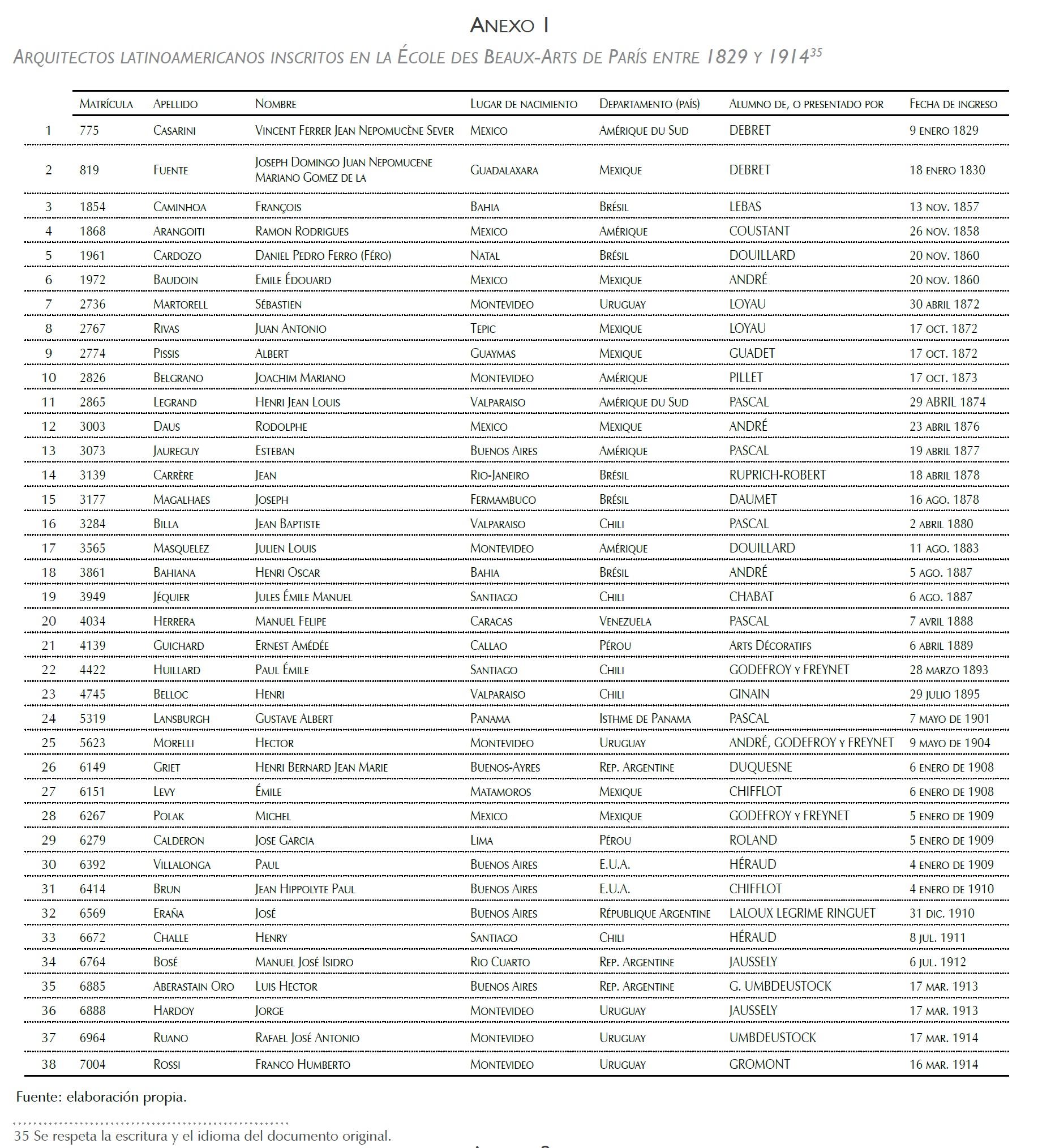 Una vez señalado el contexto general del tema, y teniendo en cuenta la información que se ha adelantado, se puede pasar directamente a los actores de esta historia. ¿Cuántos y quiénes fueron estos alumnos? El análisis de los libros de matrícula arrojó un total de treinta y ocho arquitectos latinoamericanos inscritos en la École des Beaux-Arts de París entre 1829 y 1914 (ver la lista en el anexo 1). Este universo profesional es rico y variado, y plantea nuevas interrogantes. Se vuelve a la cuestión de ¿a quién se le puede considerar latinoamericano en el siglo XIX? Si en la actualidad el término es impreciso, ¿cómo se puede trasladar a aquella época?