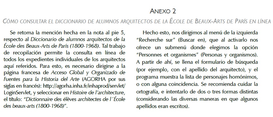 4Responsable en el INHA del programa Dictionnaire des élèves architectes de l’École des beaux-arts, 1800-1968 (Diccionario de alumnos arquitectos de la Escuela de Bellas Artes de París, 1800-1968). Este último ha sido puesto en línea recientemente, convirtiéndose en la principal fuente de información sobre los alumnos arquitectos de dicha institución. Véase el Anexo 2.