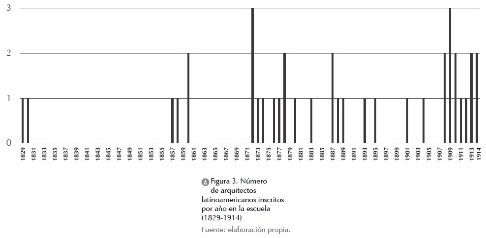 Volviendo al tema central, y teniendo conciencia de las peculiaridades señaladas, es posible obtener un poco más de información. La gráfica de la figura 3 presenta el volumen total de los alumnos identificados, organizados según el año de ingreso en la École. Cada columna indica el total de inscripciones que se realizaron cada año (máximo tres, lo que solo ocurrió en dos ocasiones), señalando así los periodos de mayor afluencia. Si la figura 2 podía insinuar una presencia desde la primera mitad del siglo (a partir del primer alumno inscrito en 1829), esta misma gráfica revela un panorama completamente diferente. A excepción de los dos primeros alumnos (que ingresaron en una época bastante temprana), el resto de arquitectos se unieron a la escuela en la segunda mitad del siglo. Además, es posible apreciar que en los últimos siete años (de 1908 a 1914) encontramos a trece estudiantes (un tercio del total). Esto podría ser el reflejo del crecimiento económico de los países de la región, expresado en el envío de sus estudiantes al extranjero, lo que estaría de acuerdo con lo insinuado en la figura 2.