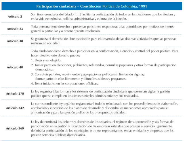 La tabla 1 muestra los principales artículos de la Constitución Política de Colombia de 1991, que hacen alusión de forma general a la participación ciudadana.
